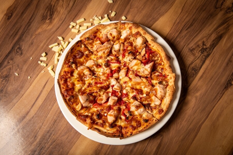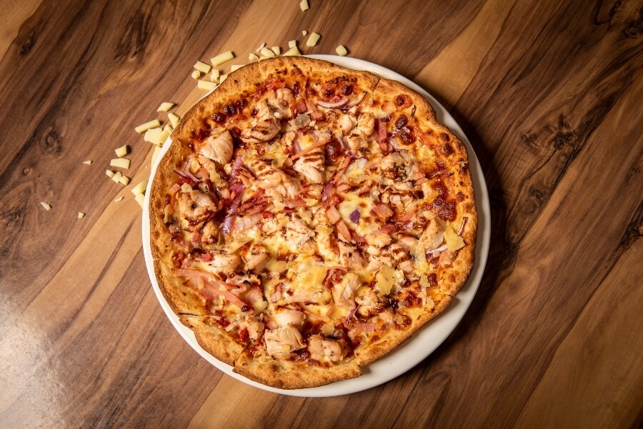 Napolitana sauce, chicken, salami, ham, pepperoni, crispy bacon, mozzarella cheese, and drizzled with bbq sauce