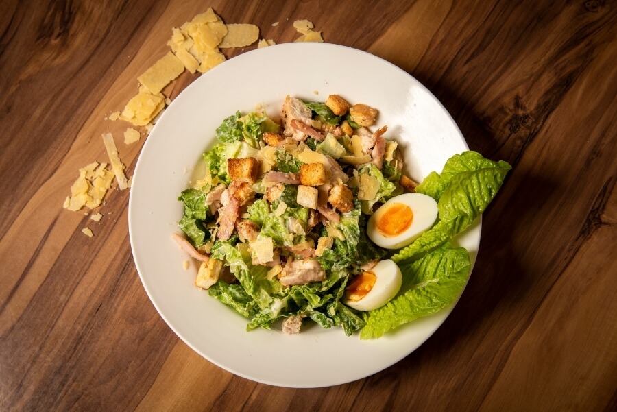 Fresh grilled chicken tenderloin, cos lettuce, crispy bacon, parmesan cheese, croutons, caesar dressing, topped with a boiled egg