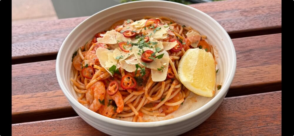 Fresh prawns, Noosa red tomatoes, tomato sugo, white wine, olive oil. garlic, chilli, basil