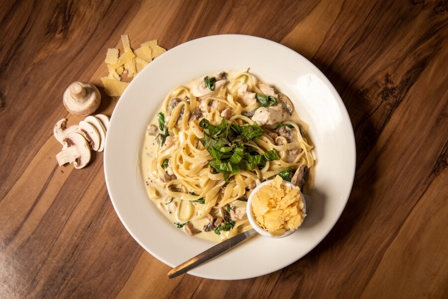 Creamy white garlic sauce, chicken, mushrooms, baby spinach. parmesan cheese